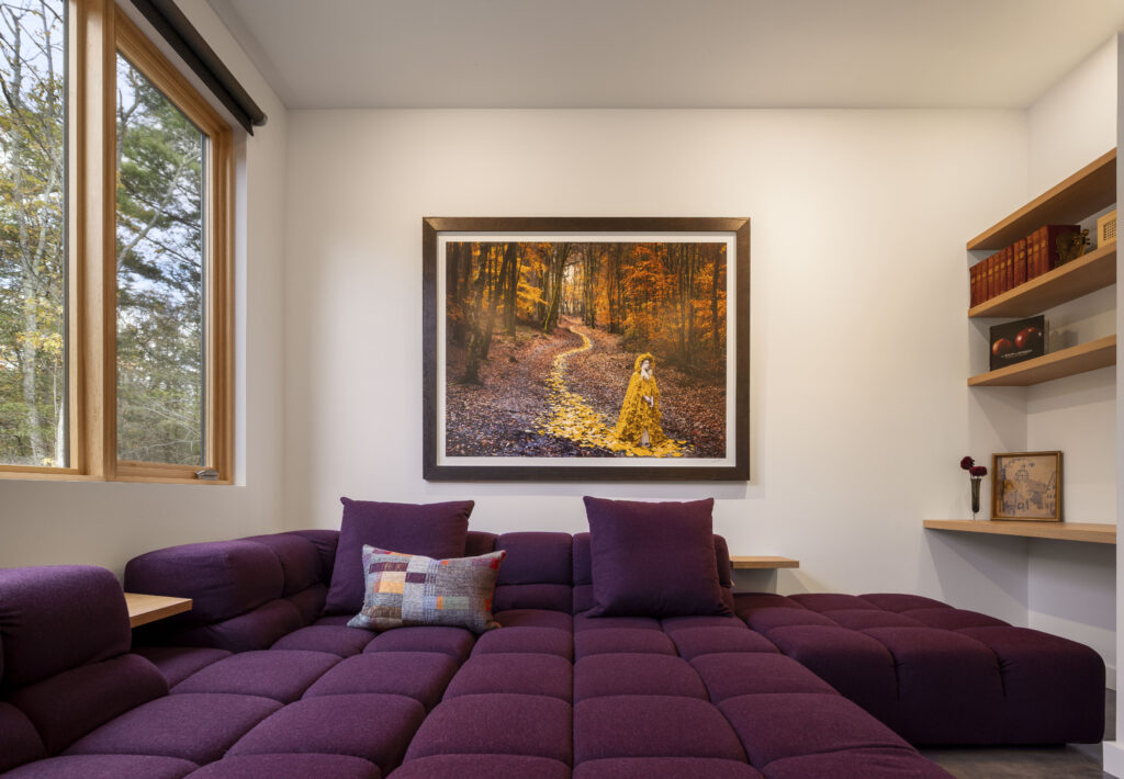 Finally, a photograph of a series of doorways directly influenced the three wood-lined thresholds that mark the transitions from the primary living area to each of the private areas of the home. At nearly three feet deep and clad entirely in warm white oak, these transitional spaces become rooms unto themselves – brief moments of compression and release that heighten awareness as one moves from space to space. The white oak wraps overhead and underfoot, creating wooden passages that encourage a conscious breath before crossing into the next room. With this series of moves, our client’s treasured artwork becomes embedded within the architecture of the home, not simply presented within it.