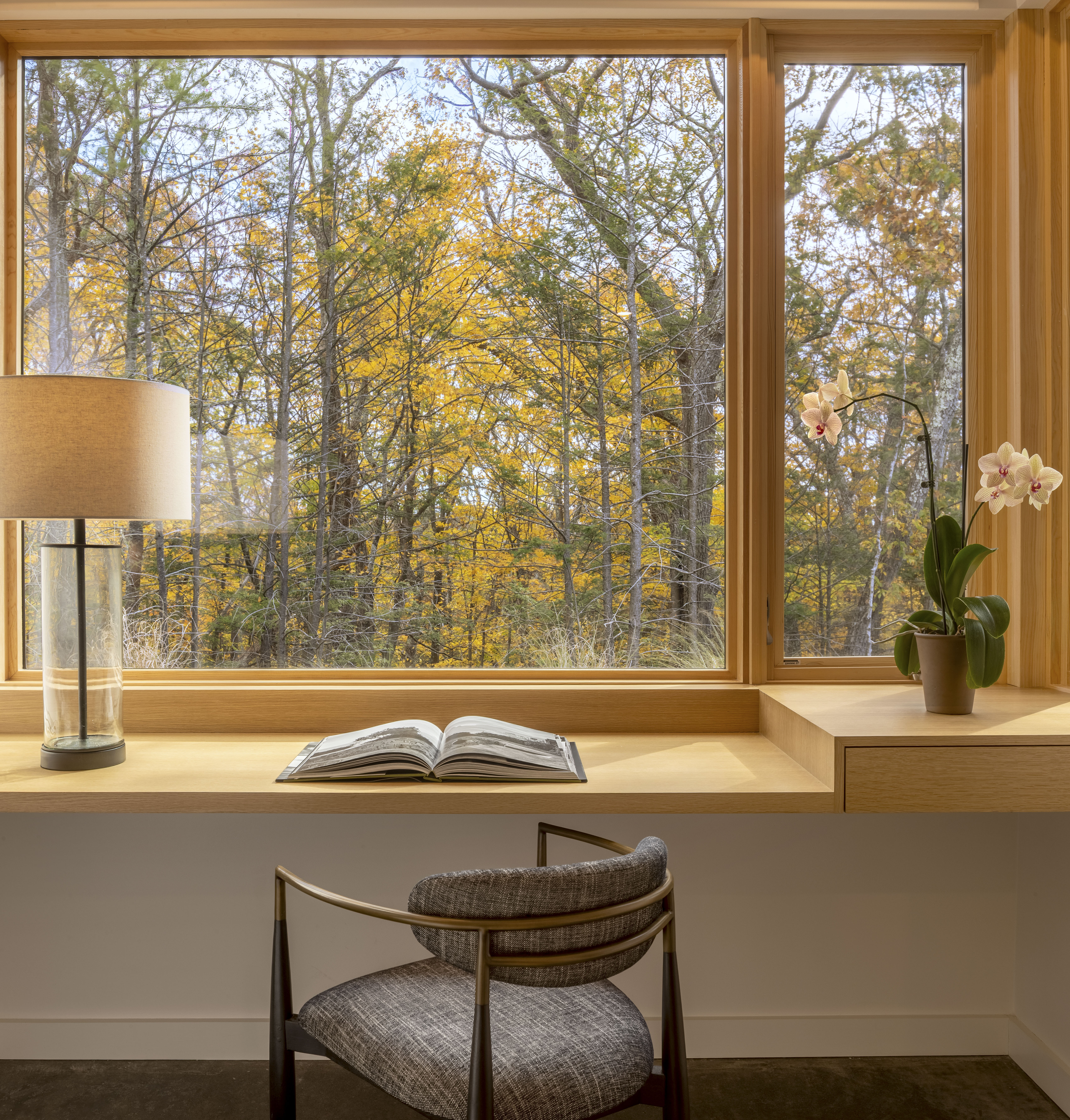 The main bathroom is designed to be our client’s sanctuary. A large built-in tub provides a peaceful place to soak while looking out at the forested landscape beyond. An integrated sink is surrounded by windows that provide natural light for the space.