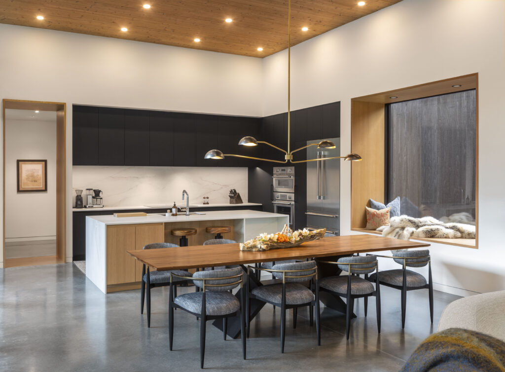 Severance, an encaustic piece that plays with symmetry, division and contrast, was the inspiration for a large, square roof, and for the primary color palette of the home: black, white and warm wood. The central piece of driftwood also echoes the axis originally inspired by Fermata. The square roof denotes the public areas of the home: the entry, main living areas, the courtyard, and an eastern facing deck with a built-in outdoor fireplace. Three private wings provide the home’s support spaces: a functional wing that contains the garage and laundry; a guest wing with two bedrooms, one of which doubles as a media room; and the main bedroom suite, which also includes a compact home office.